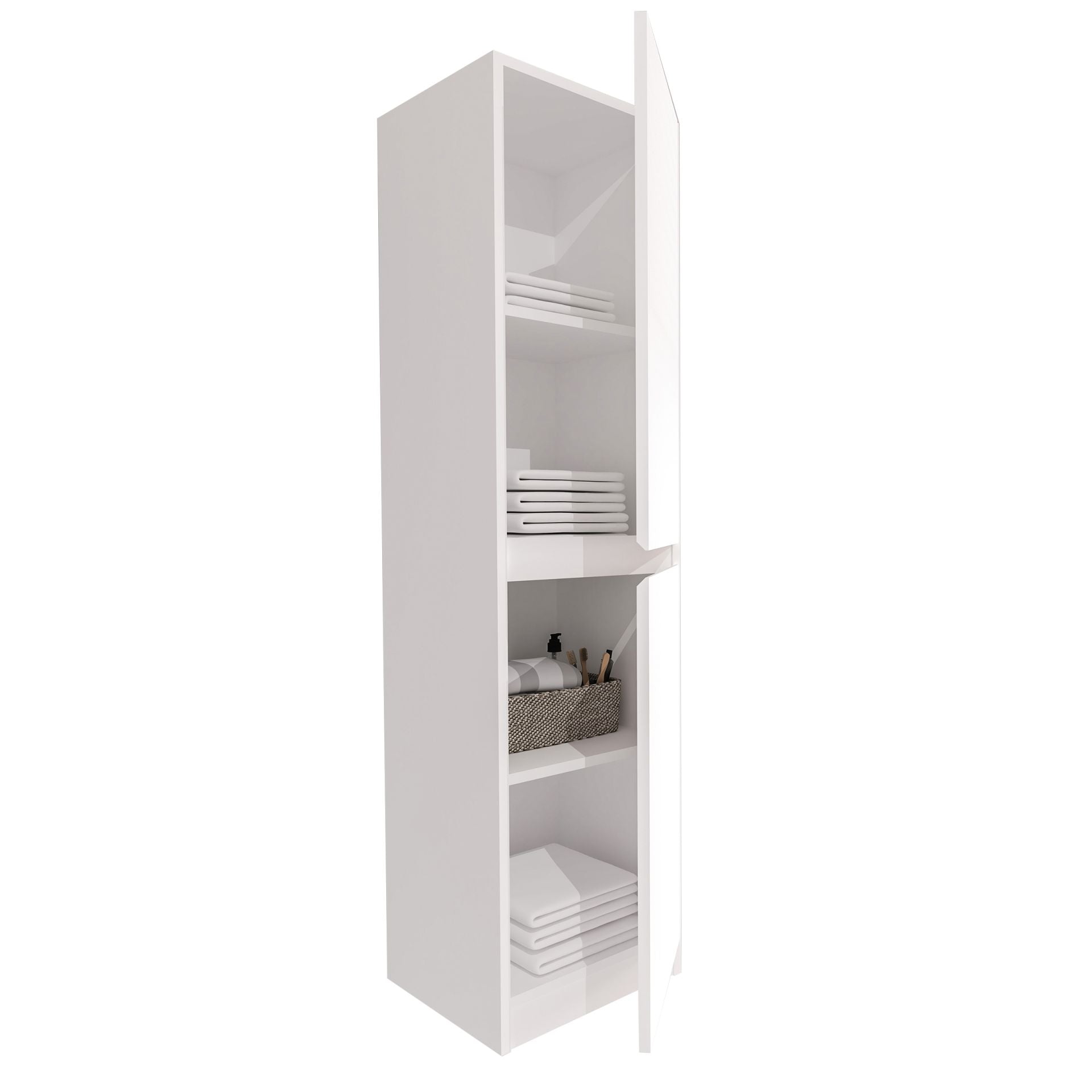 Der Hochschrank ist in zwei Höhenvarianten (135 cm oder 160 cm) erhältlich und bietet hinter zwei Türen großzügigen Stauraum für Handtücher, Pflegeprodukte und Badaccessoires. Die integrierte Soft-Close-Funktion sorgt für ein sanftes, leises und komfortables Schließen der Türen.