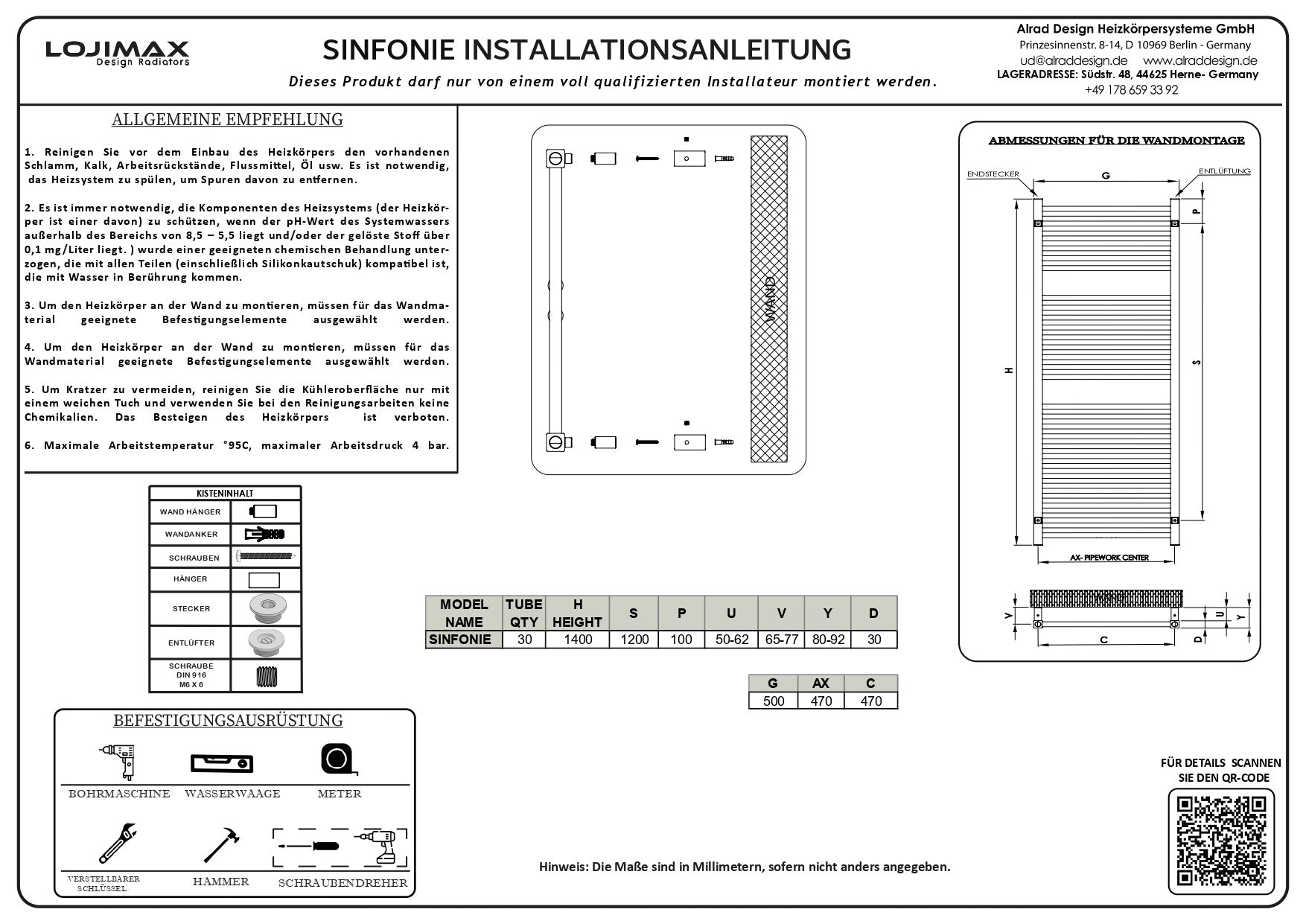 Technischer Vorteil: Das SINFONIE-Design-Badheizkörpermodell aus Stahl hat eine Leistung von 725 W, besteht aus 30 Rohren und hat die Maße 500*1400 mm. In Bezug auf die Montage bietet es den Vorteil eines seitlichen Anschlusses. Es wurde Stahl in E195-Qualität gemäß der Norm 10305-5 verwendet.